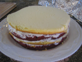 At this point I suggest letting is cool by (of course turning the oven off) cracking the oven door about and inch or two and let cool for about 1 hour. Then remove it from the oven and let it cool for another hour. Then, cover the top with foil and place in the fridge for at least 4 hours. I left mine over night and assembled the cake the next day.